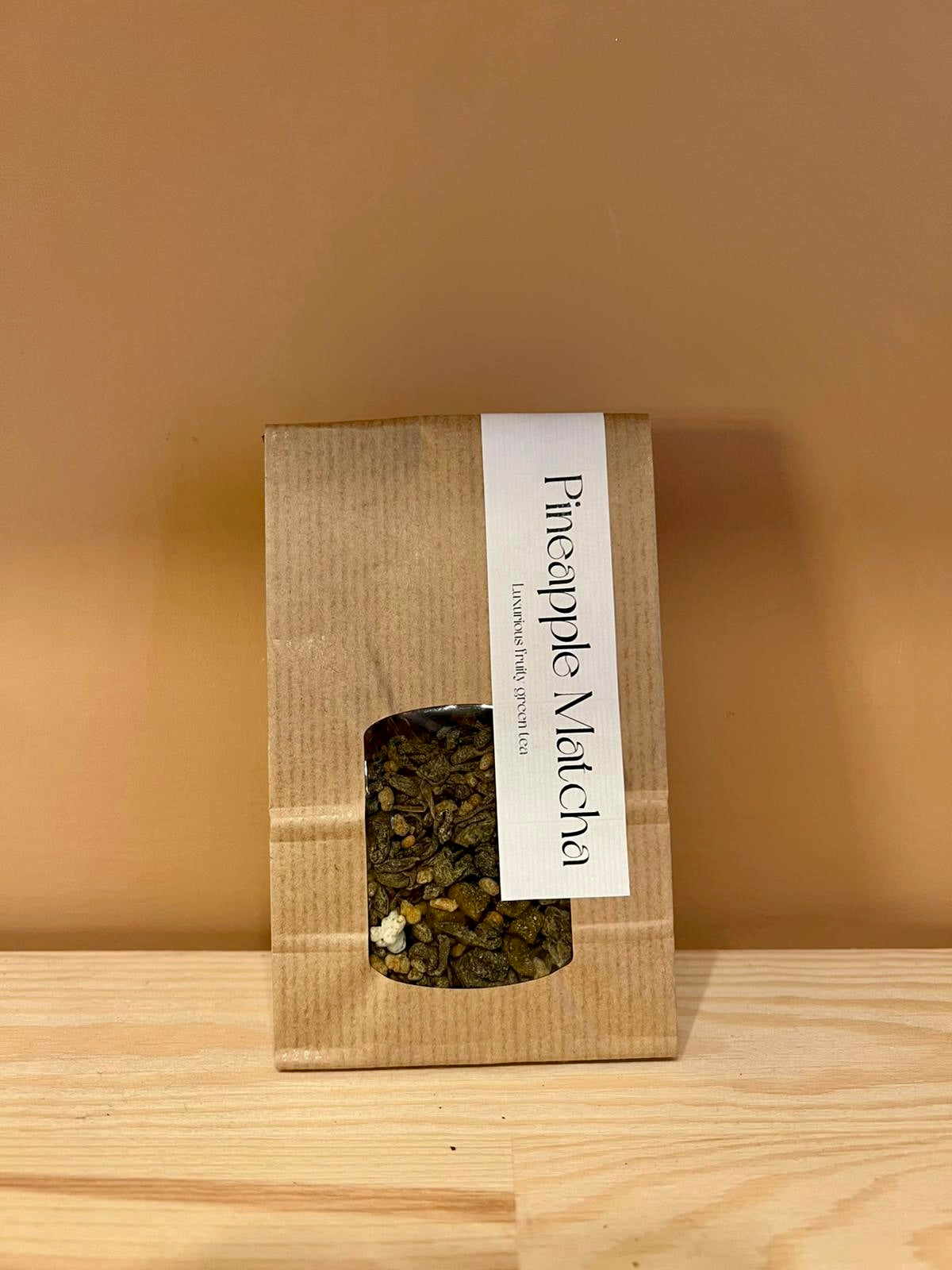 Ingredients: Chinese gunpowder green tea, candied pineapple bits 25%, roasted rice, flavouring, Japanese Matcha 3%, popped rice
